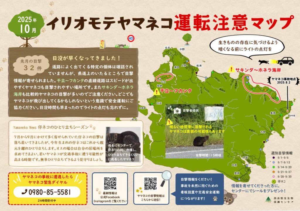西表野生生物保護センターでは、みなさまから寄せられたヤマネコの目撃情報をもとに「イリオモテヤマネコ運転注意マップ」を毎月作成しています。