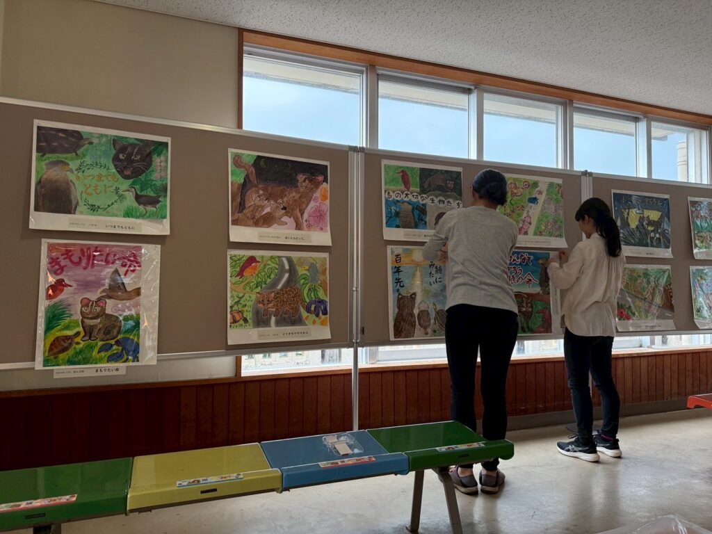 また、午後には、「イリオモテヤマネコと希少動物たちを守ろう!絵画コンクール」の表彰式の補助もさせていただきました。このコンクールは、絵画を通して、イリオモテヤマネコをはじめとした西表島の希少な野生生物についての島民・観光客の保護意識を高め、西表島の野生生物保全を啓発することを一つの目的として開催されています。皆さんの応募作品はどれも力作ばかりで、絵画を通して自分たちが暮らしている地域の自然に目を向け、またその自然を保全していくためにはどうすればよいのかを考えるきっかけになっていることが見て取れました。絵を描く過程で、応募者は必然的に自然をよく観察することが求められ、また鑑賞者も、様々な視点で切り取られた自然を見ることで身近な西表島の自然に改めて目を向けることが出来るため、両者にとって西表島の自然を見つめ直すとても良い機会になっていることが分かりました。