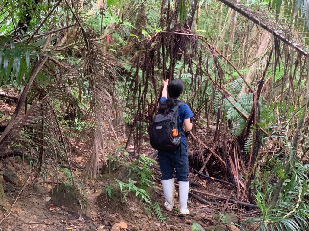 横断道は、西表島の浦内~大富まで、まさに西表島を横断している登山道で、西表島の主要な登山道の一つです。整備は西表島のガイドの方などたくさんの人の協力によって成り立っており、活動では、利用者の安全を確保するために、伸びすぎて登山道を覆っている下草や倒木の除去などを行いました。登山道は険しい道も多く、維持管理を行いながら踏破するにはかなりの体力が求められますが、皆さん難なく作業をされており、活動を通して皆さんの西表島の自然への熱い思いがひしひしと伝わってきました。道中、登山道から観察できる植物や動物、川の源流についても教えていただき、私自身も、西表島の自然に対する知見を深めることができました。